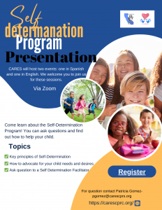 CARES CPRC invites you to the Self-Determination Program Presentation! This event will help you learn how does the Self- Determination program can help you or your child become more independent . Gabriela Ceja and Carin Jeronne will lead the sessions in both Spanish and English on different dates. Please see the details below.